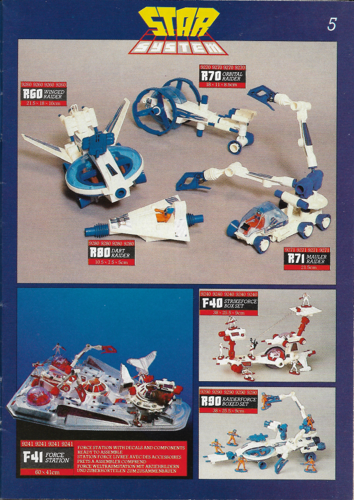 In 1985 the Britains Space line was redeveloped and renamed as “Star System.” The yellow Stargard theme was replaced with a white theme called “Forceguards” and using the same bubble-helmetted characters now coloured white. The Cyborgs also used the same moulds but were renamed as Force Cyborgs and coloured white with red highlights.The Aliens became Alien Raiders coloured in blue, orange and white, the Mutants became Mutant Raiders, and the non-humanoid mutants got a name of their own – Terror Raiders – as well as a new Orange paint scheme.