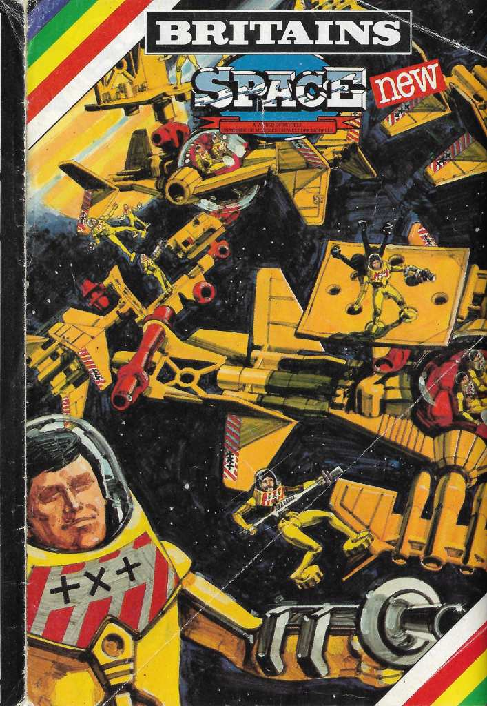 Britains Space began life as a line of space-themed toys manufactured by the W Britains toy brand. The toys were composed primarily of plastic with metal (zinc-based Zamak alloy rather than lead or pewter) used in base elements that would weight the toys down and give them some heft. The toys were designed with a retro feel and although there was no lore or background supplied, catalogues named the yellow-coloured bubble-helmetted human figures as “Stargard” and the black-coloured and red-helmetted figures as “Aliens.”